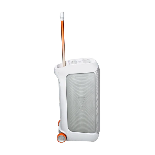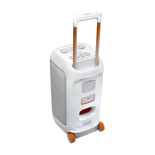 telescopic handle and wide, sturdy wheels mean you can roll the JBL